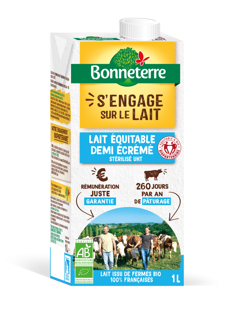Le lait Bonneterre est issu de notre filière 100% engagée dans l’agriculture biologique, en partenariat avec BIOLAIT ; premier collecteur solidaire français de lait bio français.